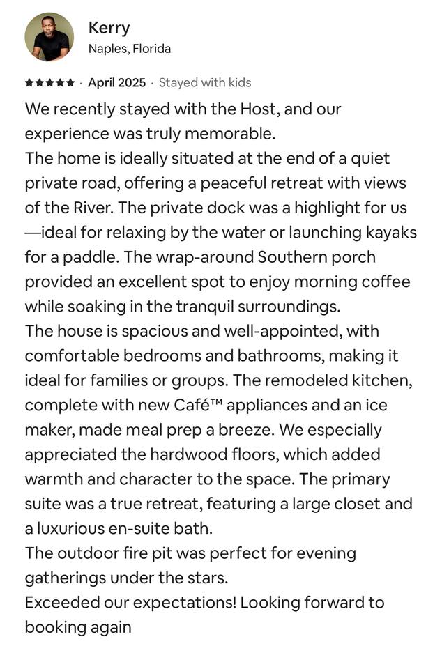 • Waterfront Property: Please be aware that this is a waterfront property. For the safety of both guests and wildlife, feeding or interacting with wildlife is strictly prohibited. Additionally, swimming is not allowed. • Access to Water: Be prepared for a steep walk from the house down to the water, especially if you’re bringing kayaks or paddleboards. It’s a beautiful view, but it can be a bit of a trek! • Security Cameras: For your safety and security, we have doorbell and driveway cameras that will be operational during your stay. • Respectful Environment: We warmly welcome guests who appreciate a peaceful and respectful environment. Please note that parties, events, and large gatherings are not permitted. We kindly ask that noise levels be kept to a minimum to respect our neighbors. Thank you for your understanding! Important! "By using this kayak for free, you agree that the owner is not liable for any accidents, injuries, or damages. You assume all risks and release the owner from all claims. Use at your own risk." Pet Safety Alert on the Dock Please be cautious when bringing pets to the dock. This is Florida, and alligators 2 are common in the area. For your pet's safety: • Keep pets on a short leash at all times. • Never leave them unattended near the water. • Avoid the dock during dawn, dusk, or low-light hours when alligators are most active. We look forward to hosting you for a relaxing and enjoyable stay! Mo