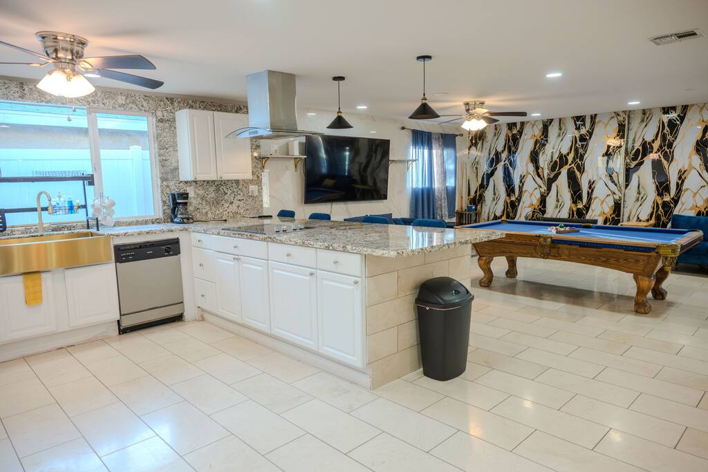 💗Welcome to Your Las Vegas Retreat💗 💗Prime Location💗 ➡️Just minutes from the iconic Vegas Strip ➡️A quick 10-minute drive from the airport ➡️Nestled in a serene neighborhood for a peaceful getaway 💗Outdoor Oasis💗 ➡️Dive into relaxation with a private, sparkling swimming pool ➡️ Unwind in the inviting hot tub under the desert stars ➡️ Fully fenced backyard with a fire pit, outdoor kitchen, and sun loungers for leisure and entertainment ➡️Spacious private patio or balcony for alfresco dining and lounging * Affordable and awesome for bachelor and bachelorette groups! This cozy unit offers plenty of space to gather, with a large balcony for BBQs, smart TV for streaming, and proximity to affordable entertainment spots. Perfect for toasting the bride- or groom-to-be without breaking the bank. Fits up to 6—fun times await* 💗Accommodations & Space💗 ➡️ Four bedrooms with comfortable bedding configurations: 2 King beds 2 Queen beds 1 Full bed 2 Rollaway beds for flexible sleeping arrangements ➡️Three modern bathrooms equipped with essentials ➡️Comfortably accommodates up to 8 guests 💗Indoor Amenities💗 ➡️Newly remodeled gourmet kitchen, equipped with state-of-the-art appliances and cooking essentials ➡️Inviting living areas with a large TV, sound system, and reading materials for relaxation ➡️Dedicated workspace for those needing to keep in touch or work remotely ➡️Game room featuring a pool table and life-size games to entertain both young and old 💗Thoughtful Touches💗 ➡️Includes a washer and free dryer for convenience ➡️Fully stocked with essentials like premium bath products, hair dryer, extra linens, and more 💗Safety & Security💗 ➡️Equipped with exterior security cameras, smoke alarm, carbon monoxide alarm, fire extinguisher, and first aid kit 💗Additional Notes💗 ➡️The pool and hot tub are complimentary, with guests accepting full responsibility when using these amenities ➡️ Travel insurance is recommended as refunds are not provided for events beyond our control 💗Registration Information💗 ➡️Official Registration: G65-03289 Make this stylish villa your home base in Las Vegas, where relaxation meets entertainment in perfect harmony. Book now and embark on your next unforgettable Vegas adventure!