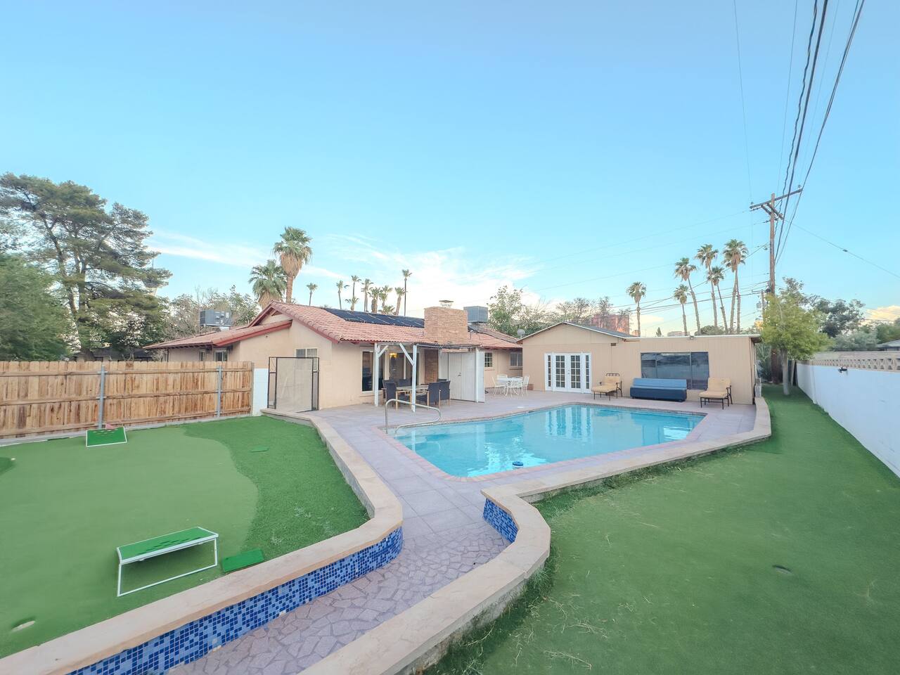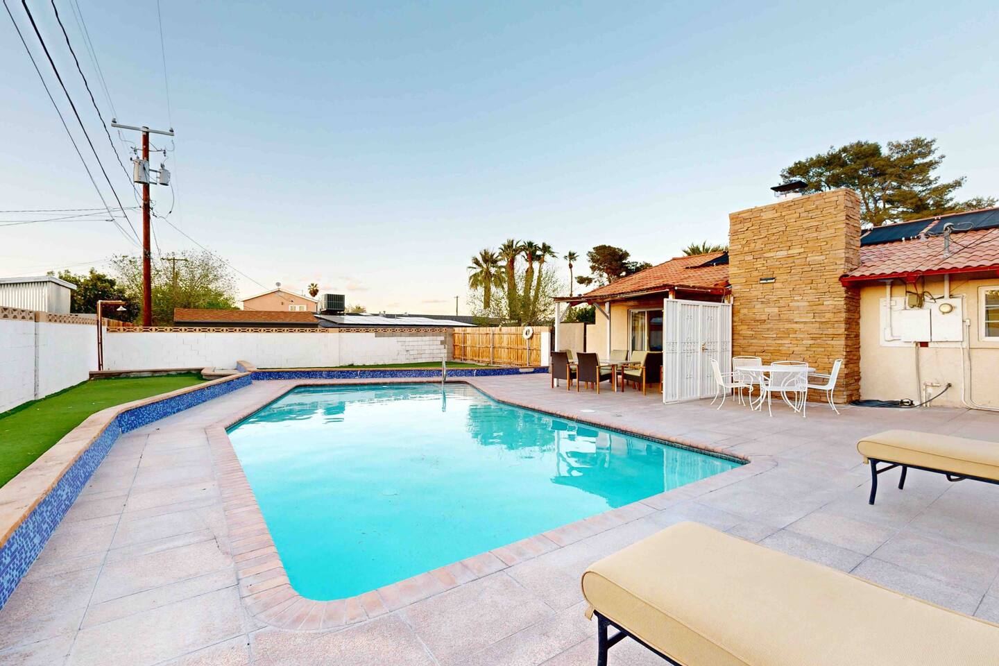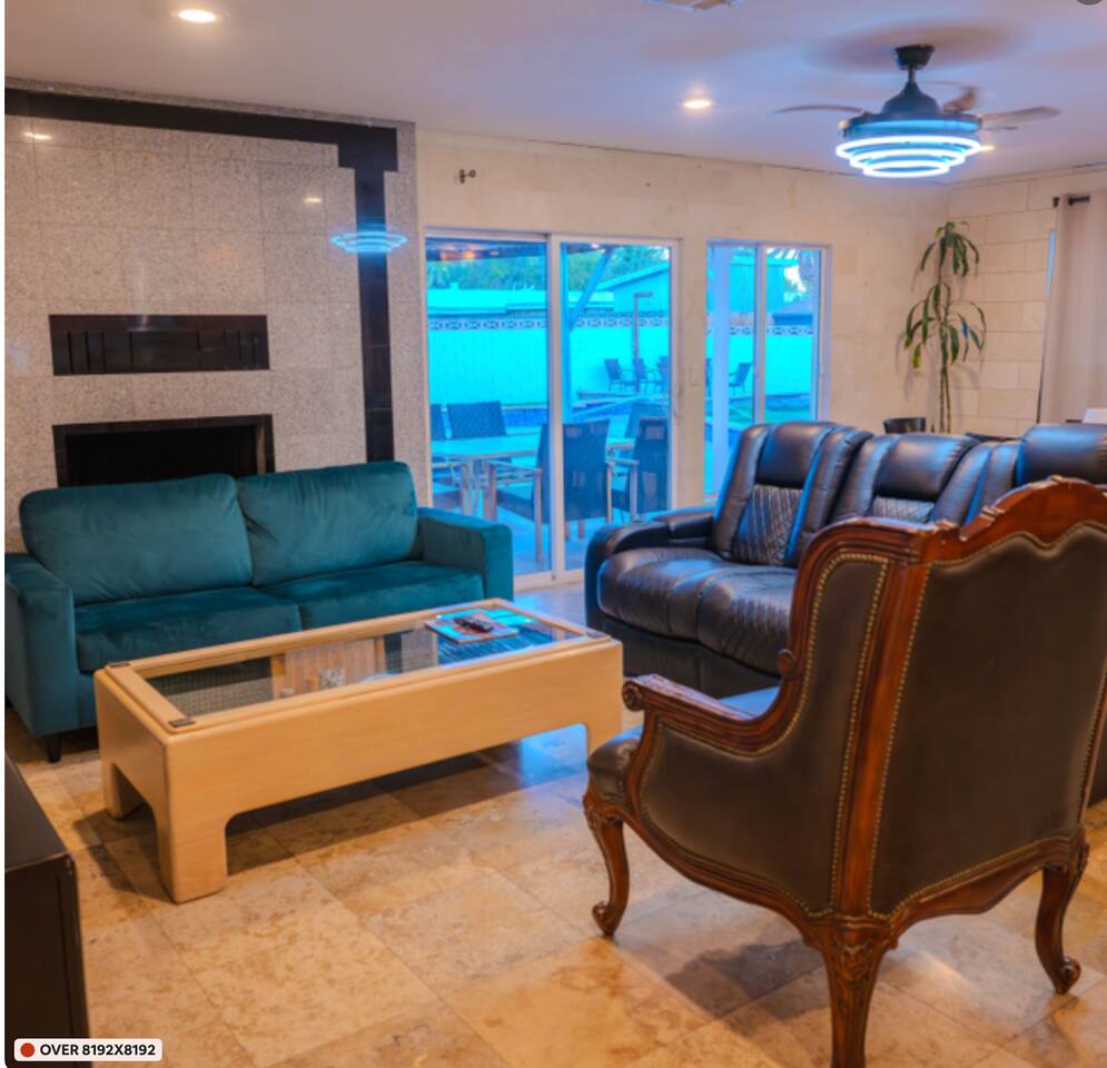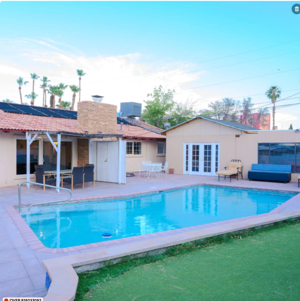 💗Welcome to the Oasis in the Desert💗 Nestled just minutes away from the heartbeat of Las Vegas, our spacious 2,027 sq. ft. sanctuary offers an unparalleled blend of tranquility and excitement, perfect for both relaxation and adventure. Immerse yourself in a vibrant setting that offers modern elegance combined with effortless comfort—all while being just a stone's throw from the hustle and bustle of the Strip. 💗The Space💗 ➡️ **Accommodations:** Spread across three thoughtfully designed bedrooms, which include a plush king bed, three queen beds, and two comfortable sleeper sofas, our home is ideally suited for groups and families. ➡️ **Private Bathrooms:** Each of the three bathrooms is equipped with premium amenities, ensuring convenience for all guests. ➡️ **Gourmet Experience:** The fully equipped kitchen, adorned with high-end appliances and kitchen essentials, paves the way for culinary exploration. ➡️ **Entertainment Hub:** Whether indoors with a game at the pool table or outside in the lavish backyard, entertainment is always at your fingertips. ➡️**Private Pool & Hot Tub:** Dive into your exclusive aquatic retreat, where the refreshing pool and soothing hot tub await. 💗Outdoor Haven💗 Step into a backyard that promises a delightful escape, featuring a private oasis complete with a BBQ setup for memorable dining experiences. Unwind around the fire pit or relax in the sun-drenched lounging area—perfect for those sunlit days and starry Vegas nights. 💗Location Perks💗 ➡️**Las Vegas Strip:** A mere 2 miles away, you're close enough to seize the energy yet retain peaceful seclusion. ➡️**Cultural Destinations:** The Arts District and Fremont Street offer a diverse mix of galleries, nightlife, and local vibes just minutes from your doorstep. ➡️**Natural Beauty:** A quick drive takes you to Red Rock Canyon, a stunning natural retreat for those who appreciate nature's wonders. 💗Guest Access💗 Experience complete access to the entire property, allowing you to fully indulge in all our amenities from the comfort of your private retreat. 💗Additional Notes💗 Please be aware that by using the pool and hot tub, you assume full responsibility—ensuring a safe and enjoyable experience as you soak up the Nevada sun. 💗Registration Details:💗 G62-09407 With key attractions just minutes away, begin your Las Vegas adventure here—a destination where memories are crafted under the dazzling desert sky. Welcome to your home away from home.